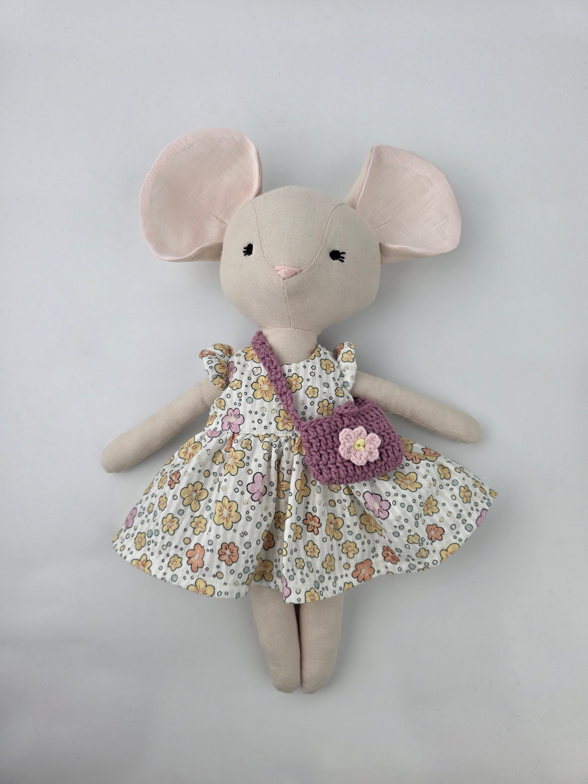 Introducing our sweet mousey doll, elegantly dressed in a summer floral dress and accompanied by a stylish handbag, she's s off on an adventure.
